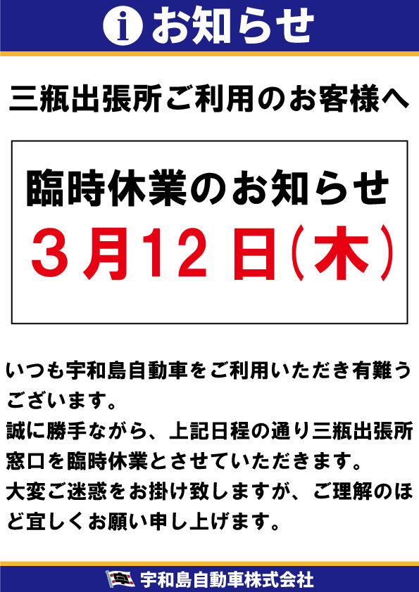 お知らせ 重要なお知らせ 2026.02.27 三瓶出張所窓口 臨時休業のお知らせ 重要なお知らせ一覧へ カテゴリ 重要なお知らせ 運行状況 路線バス 臨時バス 高速バス 貸切バス 観光情報 ツアーについて リクルート オリジナルグッズ お得情報 過去のお知らせ 月を選択 2026年2月 2026年1月 2025年12月 2025年11月 2025年10月 2025年9月 2025年8月 2025年6月 2025年4月 2025年3月 2025年1月 2024年10月 2024年5月 2024年4月 2024年3月 2024年2月 2024年1月 2023年12月 2023年11月 2023年8月 2023年6月 2023年3月 2022年12月 2022年10月 2022年9月 2022年6月 2022年5月 2021年11月 2021年6月 2021年2月 2020年9月 2020年8月 2020年4月 2019年10月 2019年9月 2019年5月 2019年4月 2019年3月 2018年12月 2018年7月 2018年2月 2018年1月 2017年12月
