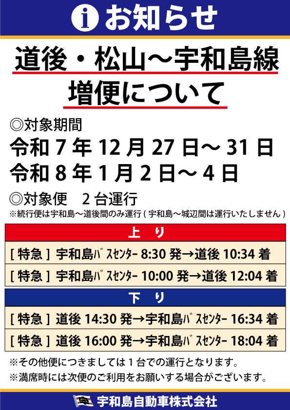 お知らせ 路線バス 2025.12.22 【年末年始】 松山~宇和島線増便について お知らせ一覧へ カテゴリ 重要なお知らせ 運行状況 路線バス 臨時バス 高速バス 貸切バス 観光情報 ツアーについて リクルート オリジナルグッズ お得情報 過去のお知らせ 月を選択 2025年12月 2025年11月 2025年10月 2025年9月 2025年8月 2025年6月 2025年4月 2025年3月 2025年1月 2024年10月 2024年5月 2024年4月 2024年3月 2024年2月 2024年1月 2023年12月 2023年11月 2023年8月 2023年6月 2023年3月 2022年12月 2022年10月 2022年9月 2022年6月 2022年5月 2021年11月 2021年6月 2021年2月 2020年9月 2020年8月 2020年4月 2019年10月 2019年9月 2019年5月 2019年4月 2019年3月 2018年12月 2018年7月 2018年2月 2018年1月 2017年12月