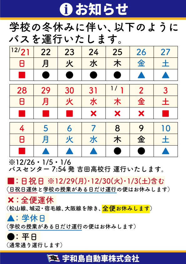 お知らせ 運行状況 2025.12.04 冬休み期間及び年末年始の路線バス運行について お知らせ一覧へ カテゴリ 重要なお知らせ 運行状況 路線バス 臨時バス 高速バス 貸切バス 観光情報 ツアーについて リクルート オリジナルグッズ お得情報 過去のお知らせ 月を選択 2025年12月 2025年11月 2025年10月 2025年9月 2025年8月 2025年6月 2025年4月 2025年3月 2025年1月 2024年10月 2024年5月 2024年4月 2024年3月 2024年2月 2024年1月 2023年12月 2023年11月 2023年8月 2023年6月 2023年3月 2022年12月 2022年10月 2022年9月 2022年6月 2022年5月 2021年11月 2021年6月 2021年2月 2020年9月 2020年8月 2020年4月 2019年10月 2019年9月 2019年5月 2019年4月 2019年3月 2018年12月 2018年7月 2018年2月 2018年1月 2017年12月